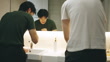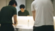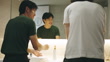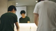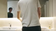 Two men washing hands and talking in restroom in office building. - 4K stock video