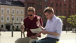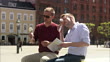 Two men with a map and ice-cream cones Malmo Skane Sweden. - HD stock video