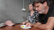 A couple eat the mango sticky rice dessert, one day in July 2025, in Bangkok, Thailand.