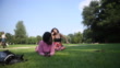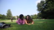 Two girlfriends lying in the grass, with a six months old Staffordshire Bull terrier pup licking the owner's face and wagging its tail in both their faces. One of the women is getting up.