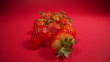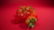 Ultra Close-Up Macro Moving Track Shot Above Fresh Ripe In-Season Bright Red Delicious Strawberries Lined Up on a Red Background