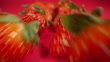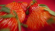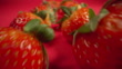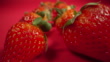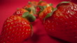 Ultra Close-Up Macro Moving Track Shot of Fresh Ripe In-Season Bright Red Delicious Strawberries Lined Up on a Red Background