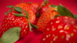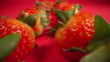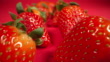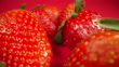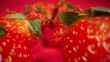 Ultra Close-Up Macro Moving Track Shot of Fresh Ripe In-Season Bright Red Delicious Strawberries Lined Up on a Red Background