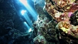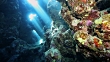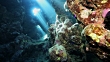 A colorful underwater cave near Dahab Egypt with light rays dancing through the coral.