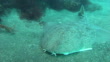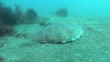 Underwater shot, close-up shot; chasing a swimming Japanese angelshark or Squatia japonica, also known as change angel shark or Japanese monkfish until it stops on the bottom of sea
