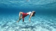 Tilt up slow motion of young female wearing bikini and red skirt floating up in clear blue ocean water with ripples and sunlight