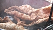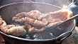 EXT MS Unidentifiable female w/ large fork boiling large pieces of pork rinds in large steaming pot, stirring, in unidentifiable market place. Food stand