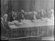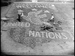 United Nation Conference on International Organization / Golden Gate Bridge / aerial view of city / delegates meet for press / communication center set up / workers design message reading San Francisco Welcomes United Nations / in Washington, delegates sign papers / British Secretary of State, Anthony Eden / President Harry S Truman meets with the American delegation / look into the Dumbarton Oaks Proposals / scan of books on various countries / Teddy Roosevelt / Neville Chamblain speaking / explosions / soldiers carry bodies / President Franklin D Roosevelt looks over papers / Cordell Hull at the Moscow Conference / starving civilians grab and eat food / war destruction in city / exterior War Memorial of San Francisco / flags from various countries flap in wind/ dead people / establishing shots of Honolulu, Rio de Janeiro, Paris.