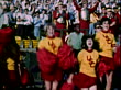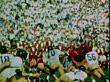 University of Southern California Trojans mascot riding white horse, brandishing sword during pre-game festivities / USC Trojans cheerleaders bouncing, cheering on sideline / Trojans running back OJ Simpson (#32) running the ball, scoring touchdown / Trojans quarterback STEVE SOGGE (#6) passing, hitting SAM DICKERSON (#18) for touchdown / Steve Sogge handing off to OJ Simpson, who runs for 40 yard touchdown against Oregon State / Steve Sogge going deep and long, passing to Sam Dickerson in the end zone for touchdown against University of Notre Dame. 1968 All-American Football Team on January 01, 1968 (Footage by Getty Images)