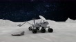 Research on the surface of Moon: New generation robotic rover on Moon ground. Lunar Rover vehicle moving on the surface of Moon, stopping to examine a stone and aiming its cameras at the stone. After the moon landing, new drone missions became more attractive and less costly. And the moon became a popular mission again.