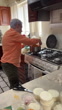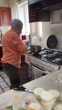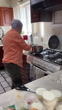 Senior woman at home unpacking and heating delivery food, Pozole, traditional Mexican food
