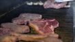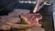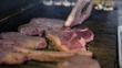 video shot of unrecognizable chef grilling variation raw steak ( ribeye, striploin, tenderloin, picanha, rump ,chuck shoulder steak )
