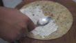 Video shot of unrecognizable man putting white sauce into tortilla (flatbread)