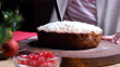 Unrecognizable person is cutting and serving Christmas Scottish Dundee cake