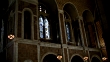 UP ANGLE OF STAINED GLASS WINDOWS IN ST. BARTHOLOMEW'S EPISCOPAL CHURCH IN NEW YORK CITY. POLICE OFFICERS VISIBLE WALKING IN CHOIR LOFT. CHANDELIER LIGHTS. ARCHED WINDOWS. PIPE ORGAN VISIBLE. GOTHIC ARCHITECTURE.