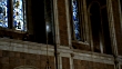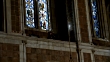 UP ANGLE OF STAINED GLASS WINDOWS IN ST. BARTHOLOMEW'S EPISCOPAL CHURCH IN NEW YORK CITY. POLICE OFFICERS VISIBLE WALKING IN CHOIR LOFT. CHANDELIER LIGHTS. ARCHED WINDOWS. PIPE ORGAN VISIBLE. GOTHIC ARCHITECTURE.