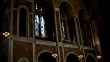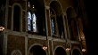 UP ANGLE OF STAINED GLASS WINDOWS IN ST. BARTHOLOMEW'S EPISCOPAL CHURCH IN NEW YORK CITY. POLICE OFFICERS VISIBLE WALKING IN CHOIR LOFT. CHANDELIER LIGHTS. ARCHED WINDOWS. PIPE ORGAN VISIBLE. GOTHIC ARCHITECTURE.
