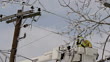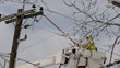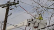 Utility worker in cherry picker reattaching power line after snow storm - HD stock video
