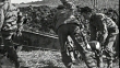 MONTAGE Artillerymen loading and firing M101 howitzer beneath camouflage netting / Italy
