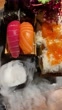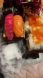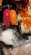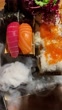 Sushi set presented with dry ice at the restaurant. Nigiri sushi with tuna and salmon, sushi rolls topped with tobiko. Social media style food video