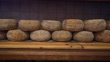Various breads in a row on a shelf in bakery.
