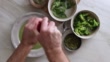 Man preparing vegetarian creamy broccoli soup with pumpkin seeds and basil on marble background