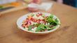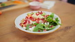 Close up on a vibrant salad on a kitchen counter in a food vloggers kitchen.