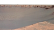 "Victoria Crater, Mars. Opportunity Mars Exploration Rover (MER-B) panoramic false-colour view of Victoria Crater, a Martian crater visited by the rover in September, October and November 2006. The rover is on the edge of the crater, on a promontory called Cape Verde. At left is another promontory, called Cape St Mary. Cape St Mary, which is 15 metres high, is about 40 metres distant. The far side of the crater is about 800 metres away. Victoria Crater is around 70 metres deep."