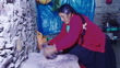 Video 4k prores hq of a Quechua woman of the Quero ethnic group in her hut in the Peruvian Andean mountains grinding wheat with a stone in her kitchen - 4K stock video