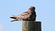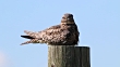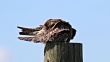 Perched on a weathered, gray fencepost, a common nightjar or nighthawk shows great detail in his feathers as he preens or grooms in the Pawnee National Grasslands on the north-eastern plains of Colorado.