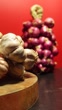 Two bundles of garlics and red onions on wooden board with rust colored background. Garlic and red onions (purple or bluehi onions), often associated with good fortune, health, and protection against evil spirits, are not only believed to ward off negativity and bring positive energy into homes during the New Year, but they also serve as staples in Vietnamese cuisine prepared for Tết, commonly featured in traditional dishes like stews, Chả Giò spring rolls, and various types of meat, all of which may be flavored with garlic and red onions.