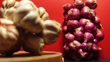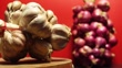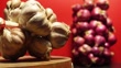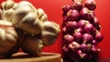 Two bundles of garlics and red onions on wooden board with rust colored background. Garlic and red onions (purple or bluehi onions), often associated with good fortune, health, and protection against evil spirits, are not only believed to ward off negativity and bring positive energy into homes during the New Year, but they also serve as staples in Vietnamese cuisine prepared for Tết, commonly featured in traditional dishes like stews, Chả Giò spring rolls, and various types of meat, all of which may be flavored with garlic and red onions.