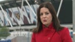 Violence at West Ham v Chelsea match; Queen Elizabeth Olympic Park:Reporter to cameraWide shot West Ham StadiumClose shot loudspeakersChris Hobbs (Former police crowd control officer) interview SOT