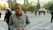 Violent protests and stikes against government austerity measures; High Angle GVs Mass protest march High Angle GV Mass protesters gathered in Syntagma Square Protesters chanting SOTMore protesters sitting on groundFemale pensioner (Angeliki Baraktari - phon) with three generations of her family Angeliki (translated) SOT- politicians have stripped Greece High Angle shot of demonstrator banging pillarDemonstrators throwing missilesHigh Angle shot of mass striking workersGVs Striking workers with placards Vox pops striking workers SOTLine of riot police wearing gas masks PAN to reporter to camera DUSKGV City skyline with black smoke rising