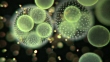 "Light microscopy of Volvox colonies. Volvox is a chlorophyte, a type of green algae, that forms spherical colonies. The individual cells are similar to the alga Chlamydomonas, are flagellated, and they co-ordinate their beating to direct the colony towards light, which they detect using eyespots. They are common in freshwater habitats. The enclosed smaller spheres are the daughter colonies of the larger parent, which are released when they are large enough. Filmed with Darkfield illumination."