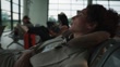 Woman resting with a neck pillow in an airport lounge, awaiting her flight.