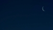 A finger nail moon crosses from left to right at sunrise.