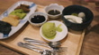 Warabi mochi and tofu matcha ice cream japanese dessert in japanese cafe