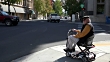 A senior man rides a mobility scooter to a street corner in Walla Walla.
