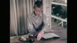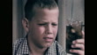 1960s: Laundry on line in sun and wind. Boy sits reading a book outside with a glass of root beer on ice. Condensation on outside of glass. Boy picks up glass and tastes condensation