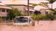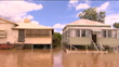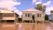 Queensland floods: waters peak in town of Rockhampton; AUSTRALIA: Queensland: Rockhampton:EXTTRACKING SHOTS from moving boat as along through flooded town, past stilt houses and vehicles submerged in brown muddy flood-water