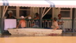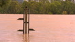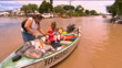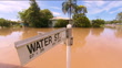 Queensland floods: waters peak in town of Rockhampton; EXTShots of river water level marker submerged by brown flood waterFamily loading boat with belongingsTRACKING SHOTS from moving boat showing Fitzroy Hotel with makeshift sign for 'Fitzroy Float-El', poeple drinking on veranda Sign for 'Water Street'