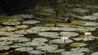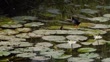 Wattled jacana is standing on a lily pad among lily pads and water lilies blooming in a pond foraging for food
