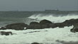 Waves crash against rocks on a beach while a ship sails past. Available in HD.