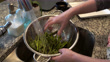 Wearing her floral apron, she prepared the asparagus by washing, trimming, and tossing them with olive oil, minced garlic, salt, and pepper. She spread them on a baking sheet and roasted until slightly charred. - 4K stock video