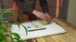 Cook weighing Dijon mustard on kitchen scale. White board on plank in kitchen area.