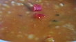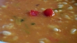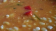 Traditional Cuban dish of creole cuisine: hot white beans thick vegetable soup garnish with red pepper