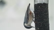 White-breasted Nuthatch, Sitta carolinensis, eating sunflower seeds from a bird feeder.