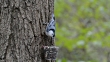 A male white-breasted nuthatch (Sitta carolinensis) samples many sunflower seeds and peanut pieces from a cup. He finally selects a black oil sunflower seed.