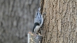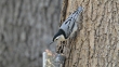 A male white-breasted nuthatch (Sitta carolinensis) samples many peanut pieces from a cup, almost leaves, comes right back. He finally selects a black oil sunflower seed.
